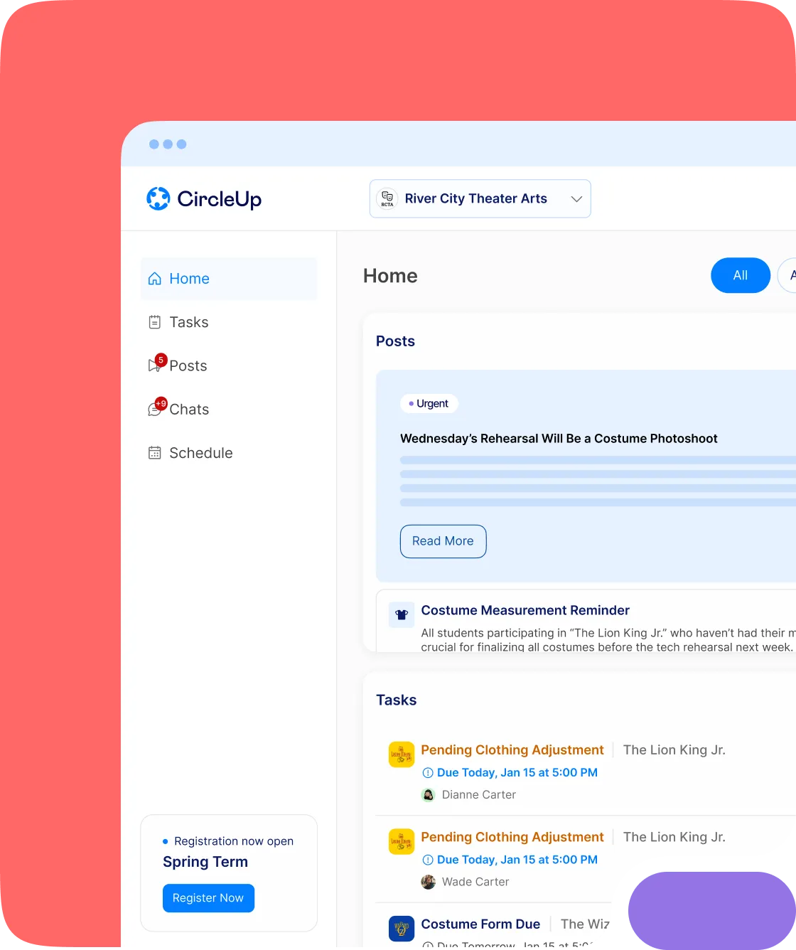 CircleUp understands theatre, band, choir, dance, summer camps, children’s theatre classes, and the beautiful chaos of performing arts education.